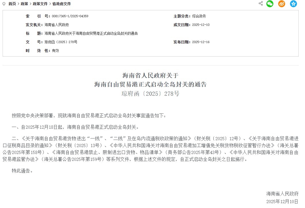 通告称,自2025年12月18日起,海南自由贸易港正式启动全岛封关。
